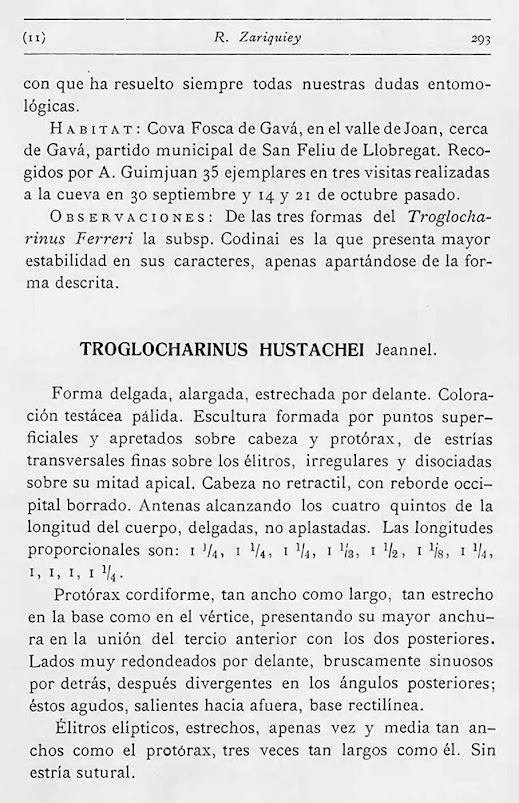 Nota: dins les dues últimes pàgines també parla del T. hustachei, del Montsec d'Ares. Ho inclou pel motiu que estudia el grup sencer dels Troglocharinus coneguts llavors.